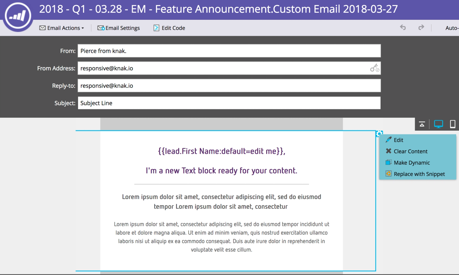 Our goal is to be able to bypass Marketo’s email editor completely, and there were still some areas (like email settings) that you still needed to go into Marketo to adjust. Now you can make an email operational or make it available through MSI right from Knak.