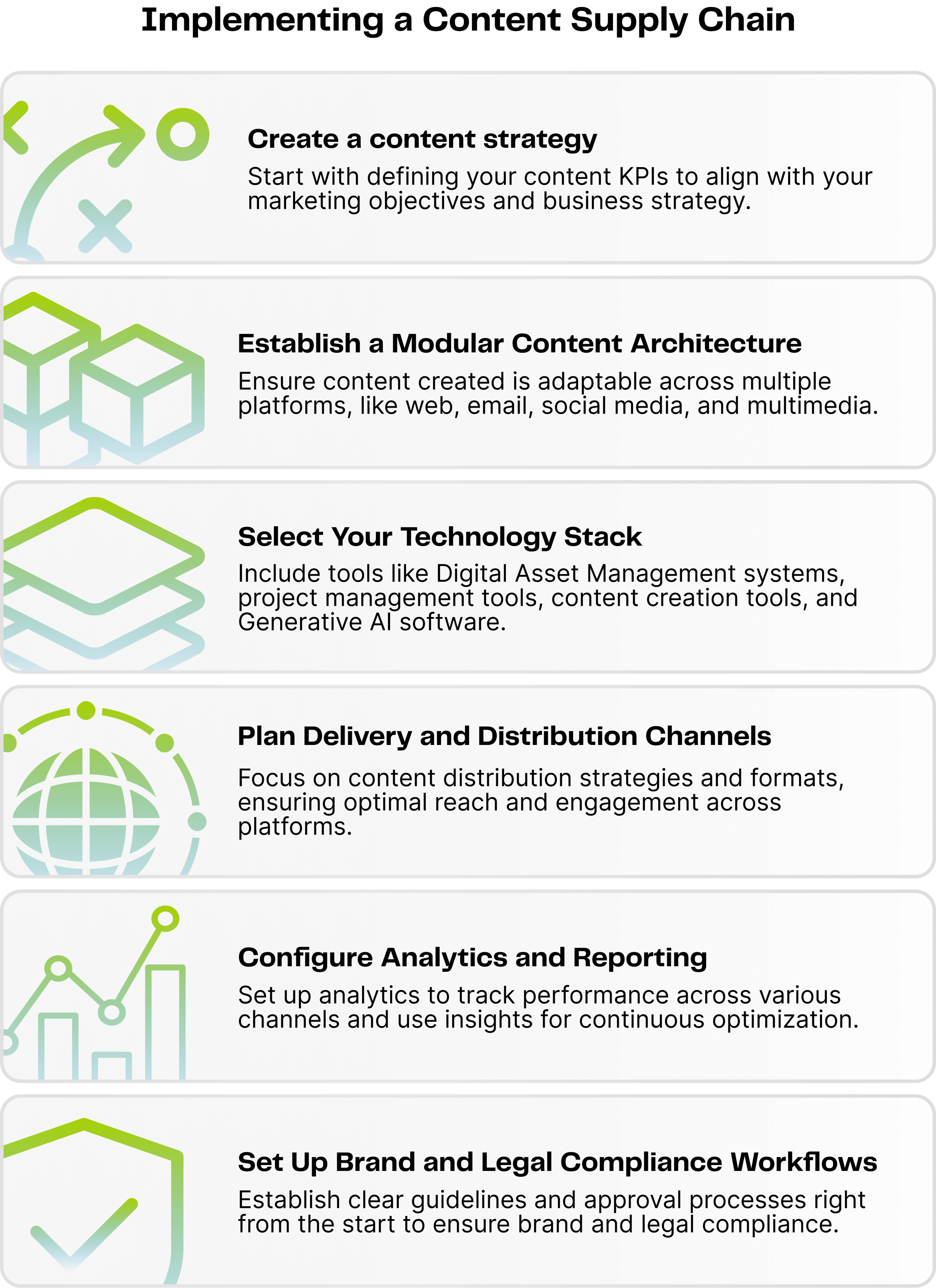 A content supply chain is the systematic process that an organization uses to plan, create, manage, distribute, and analyze content. It integrates technologies like generative AI and digital asset management (DAMs) to streamline content creation and distribution.