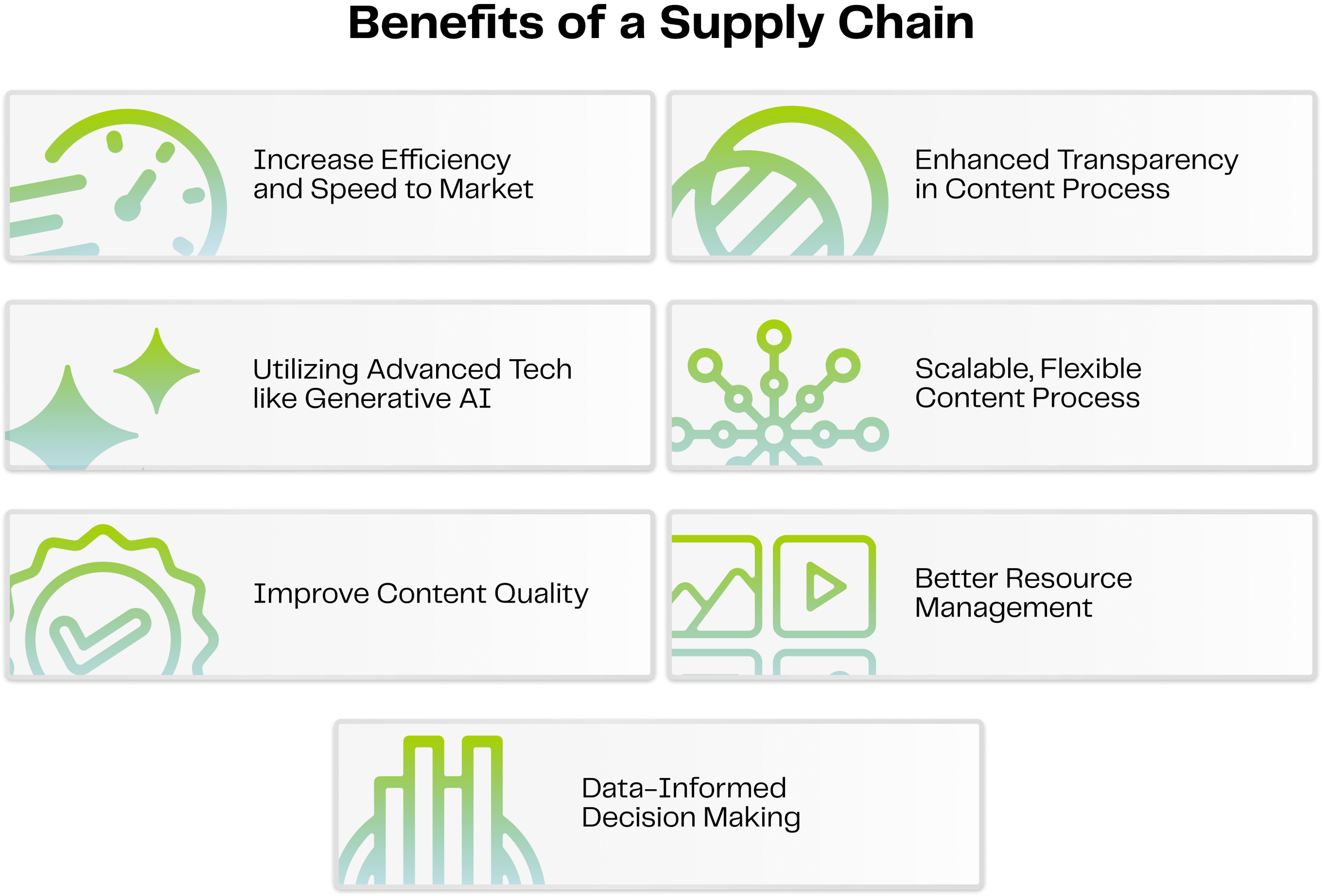 A scalable process is one that is able to keep up with increased demand without additional errors or delays. Content supply chains use modern tech like generative AI, marketing automation platforms, and no-code content creation tools to produce high quality content. Add in tooling like project management and collaboration tools, and you've got a process that keeps everyone informed and productive.