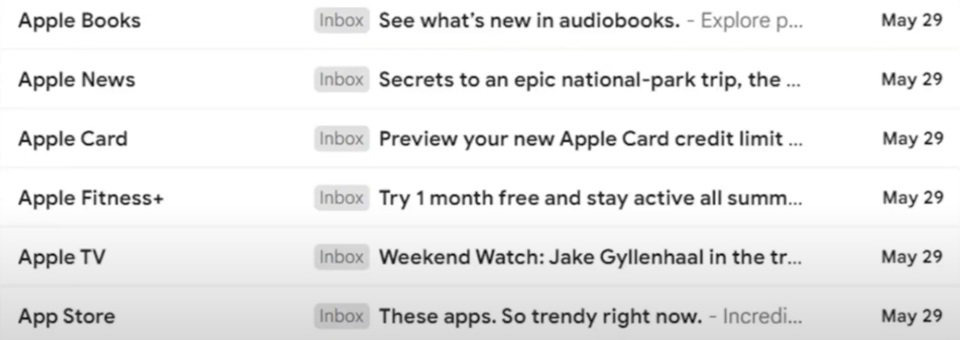 Notice how each email has a different entity sending it? Instead of sending six emails from "Apple", they sent one email from six different divisions of apple. All in one day.