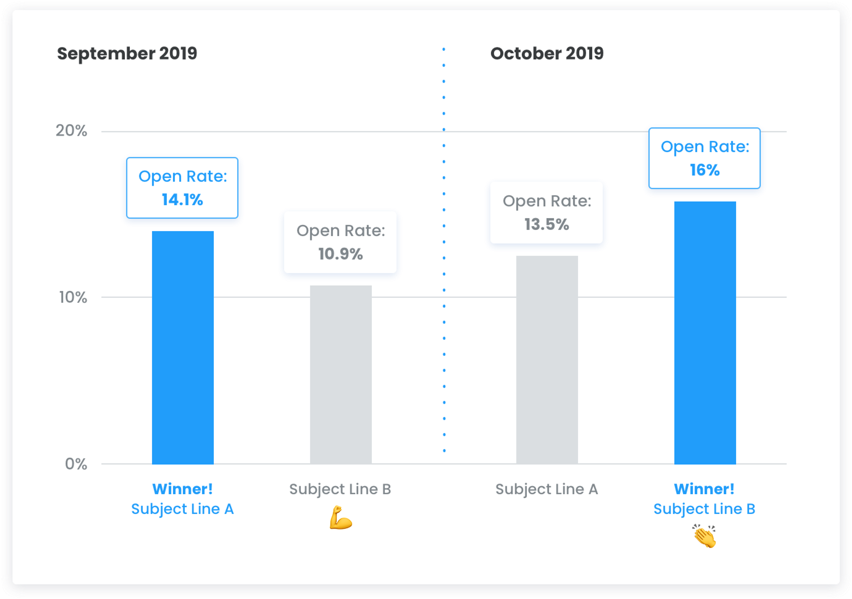 (The results? As you can see below, in September, the subject line without the emoji performed better. In October, the winner was the one with the emoji. Stay tuned for the tiebreaker …)