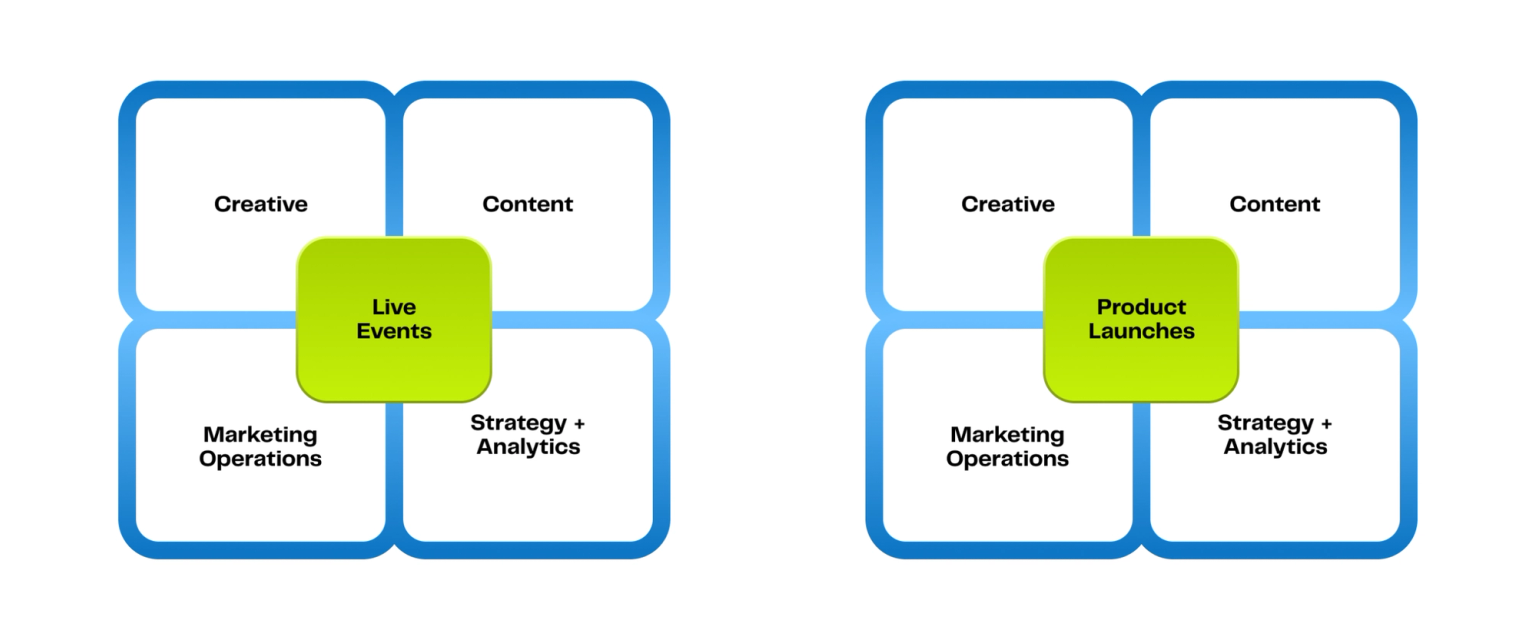 Teams are organized around specific campaigns or initiatives. Similar to agile marketing and the functional model, this model may focus more on GTM motions like supporting product-led or sales-led initiatives that require long-term investment.