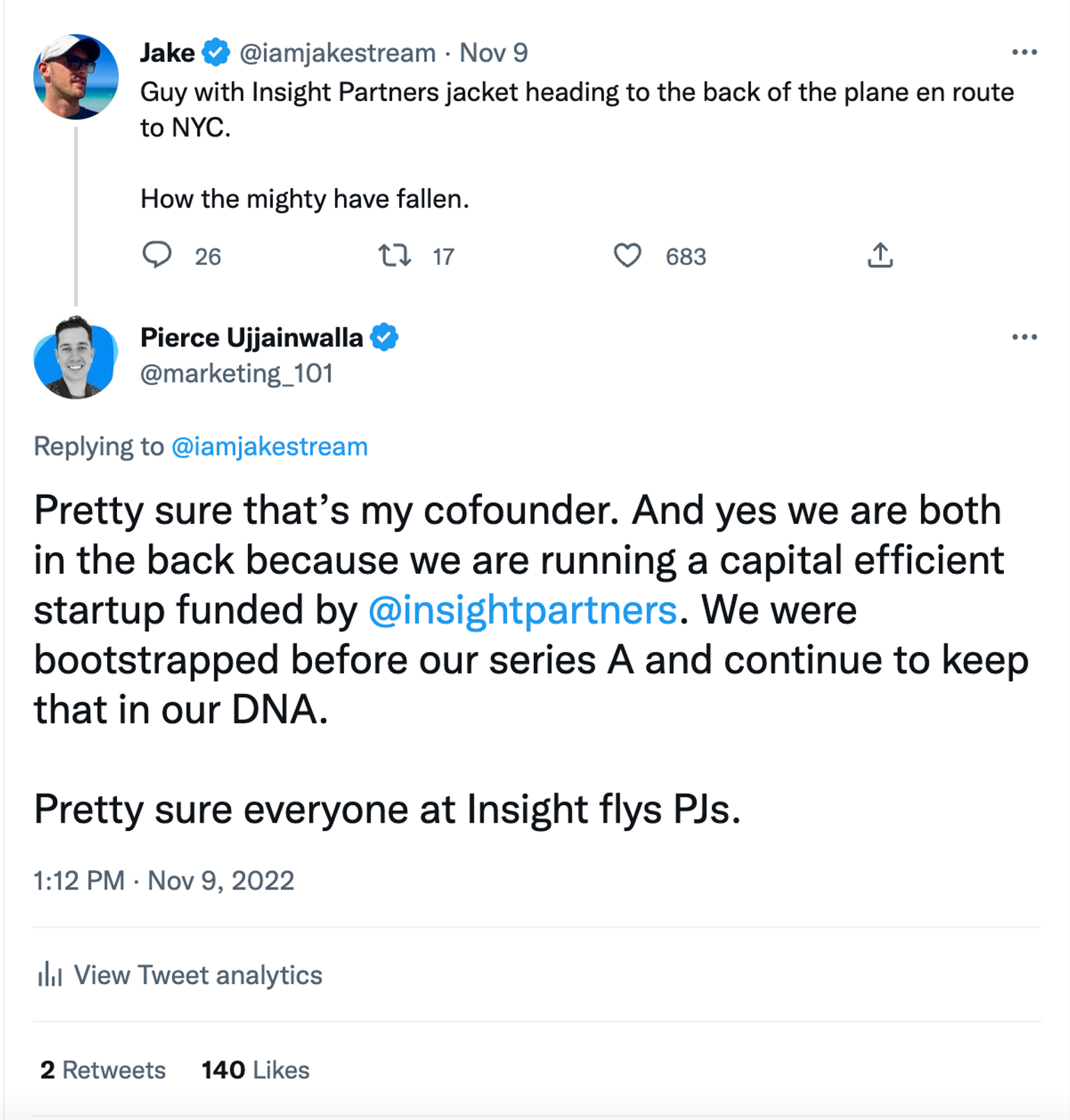 Brendan and I both Tweeted back that we were running a capital efficient startup funded by Insight Partners.