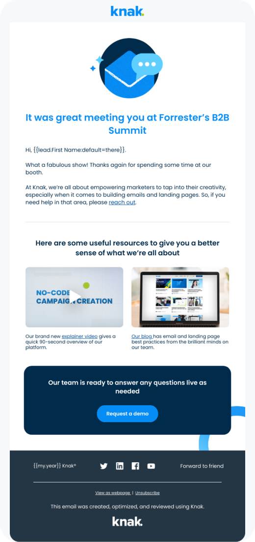 Get a demo and discover how visionary marketers use Knak to speed up their campaign creation.