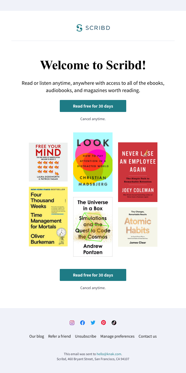 Scribd welcomes their new user to the community with a free 30-day trial.