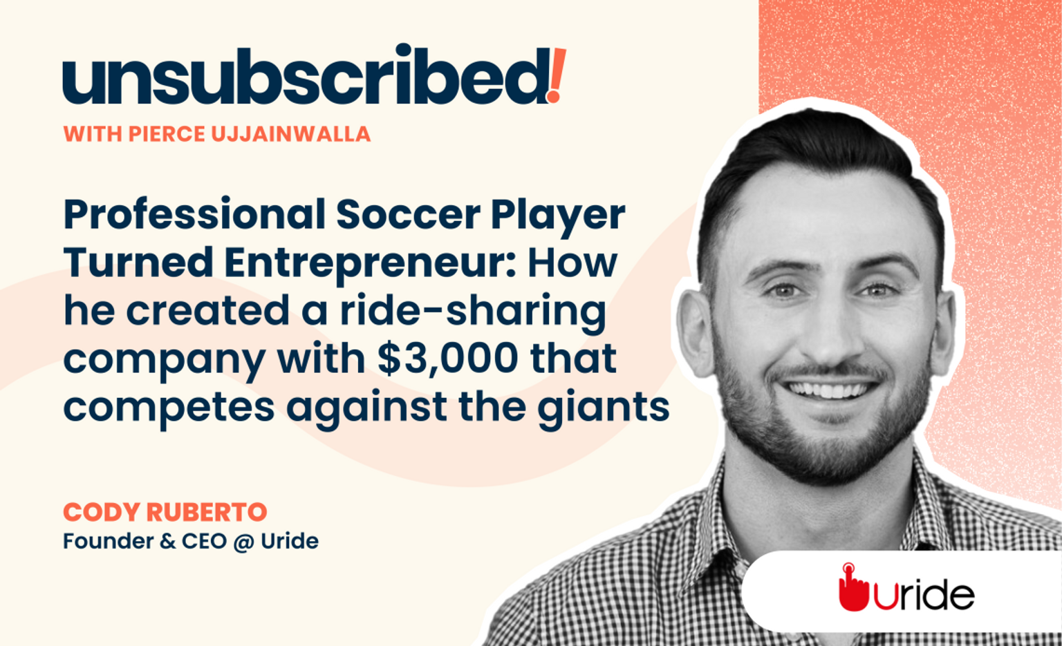 I’m Pierce Ujjainwalla and you’re listening to Unsubscribed. Every episode, I sit down with business leaders to help you question everything you thought you knew about marketing. If you enjoy this show, please do subscribe and leave a review on YouTube or your favorite podcast player. Now, on to this episode. My guest today is Cody Roberto. Cody is from a small Canadian town called Thunder Bay. At 18, he moved to Europe to pursue his dream of being a professional soccer player, which he realized and played in the Welsh Premier League. Injuries forced Cody back to Thunder Bay. where he witnessed people were getting stranded with no ride sharing options. And that’s when he started URide. URide is a ride sharing business that now does over a million rides per year across 15 different cities in Canada. Welcome to the unsubscribed podcast, Cody. It’s great to have